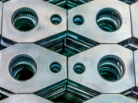 A close-up view of stacked metallic profiles displaying intricate details and textures, showcasing industrial elegance and design sophistication in a modern setting.