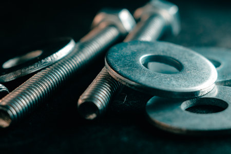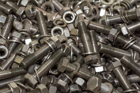 nuts, bolts, screws, washers, bearings on a metal steel background.