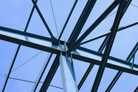 Structure of steel roof frame for building construction on sky background.