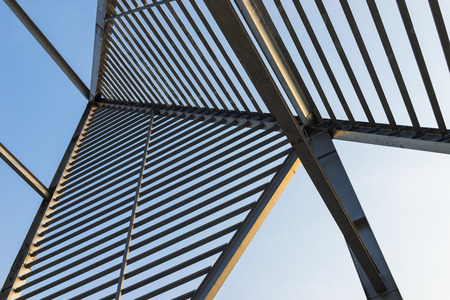 Urban abstract texture background. Point of view looking up in blue sky through old rusty geometric diagonal metal constructions of abandoned building. Horizontal color photography.
