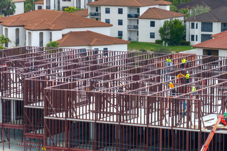 Construction site with many workers and equipment in Fort Myers, Florida. Hard labor employment at commercial development