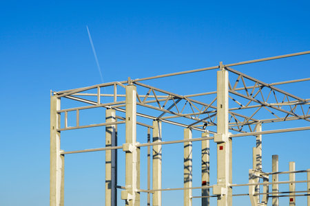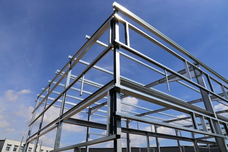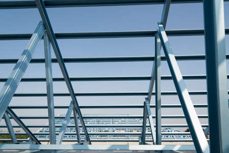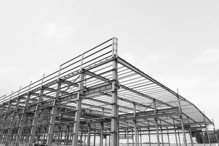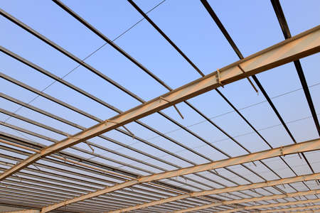 Steel frame workshop is under construction against a blue sky. New technology steel frame for construction