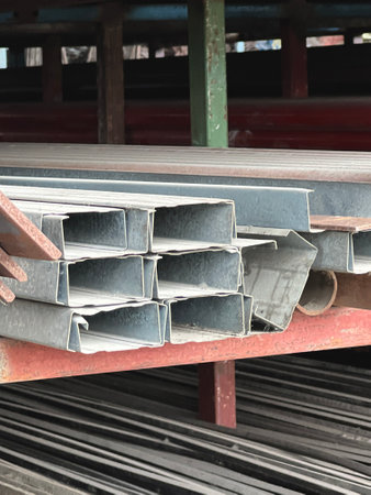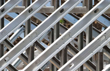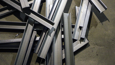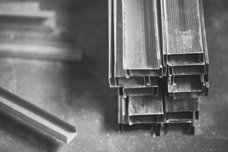 brilliant metal profiles for assembling the skeleton of insulation lies in a pile on the concrete.