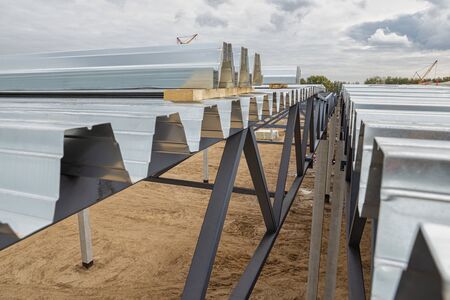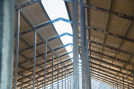 Warehouse Construction from metal structure. Industrial building on light gauge steel framing. Frame of modern hangar or factory. Construction site with steel structure warehouse. Top view on a roof.