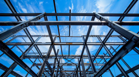 A captivating view of a steel framework structure from below, stretching upwards into a vivid blue sky dotted with white clouds, symbolizing construction and progress.