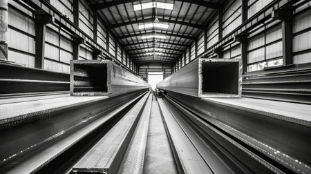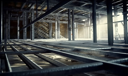 A mesmerizing composition of towering steel beams in a vast warehouse, creating a harmonious blend of strength and structure.