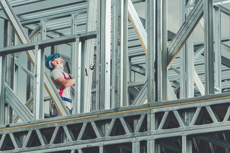 Construction Worker on Duty. Caucasian Men Building Steel Frame Building Structure. Industrial Theme.