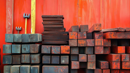 A vibrant composition of wooden planks and metal bars arranged in stacks against a striking red background, showcasing tools for craftsmanship and construction.