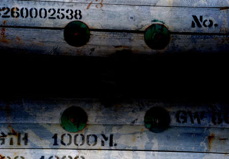 A close up view of a weathered metal plate featuring prominent rivets and rust highlighting the textures of industrial materials.