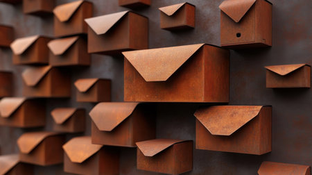 This image features an arrangement of rusty metal boxes mounted on a wall, showcasing intricate textures and a unique aesthetic. Ideal for art enthusiasts and decorators.