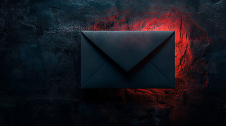 Black envelope placed on textured dark surface with dramatic red lighting, mysterious and intriguing atmosphere. Secret message and mystery concept.