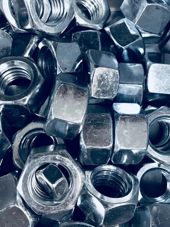 A lot of hexagonal nuts. Mechanical fasteners with a threaded hole, close up