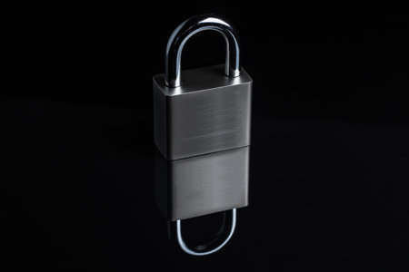 A close-up view of a closed padlock resting on a dark surface, representing concepts of security and safety in a minimalistic aesthetic.
