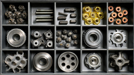 This image showcases a neatly organized collection of various metal components and fasteners, perfect for industrial and mechanical applications.