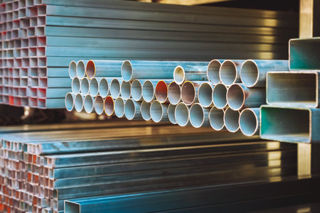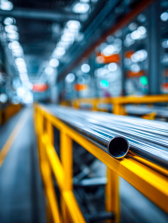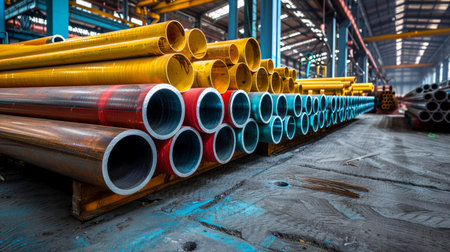 Industrial warehouse with steel pipes and long metal beams. Concept of manufacturing, structural materials, heavy industry, factory environment.