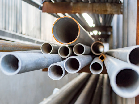 Blur abstract background. stock warehouse many kind of steel tube, carbon steel, pipes round steel. Virous types of steel are new to work construction, industrial, manufacturing and building systems.