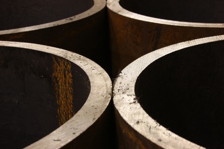 A closeup of rusty steel casing pipes under a white light