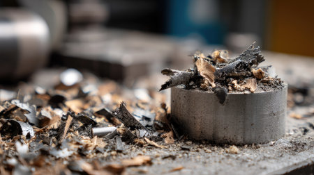 This close-up image showcases metal shavings and wood debris scattered on a workshop table, highlighting the industrial environment and craftsmanship involved in production.