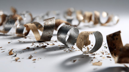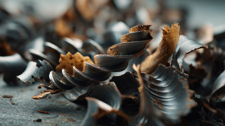 A captivating close-up image of metal woodworking shavings, showcasing intricate curls and textures scattered on a workshop surface. Ideal for crafting and industrial themes.