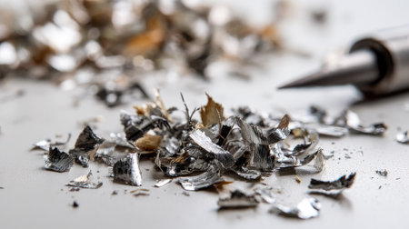 Close-up view of shiny metallic shavings scattered in an abstract arrangement on a white surface, highlighting textures and colors of raw materials.