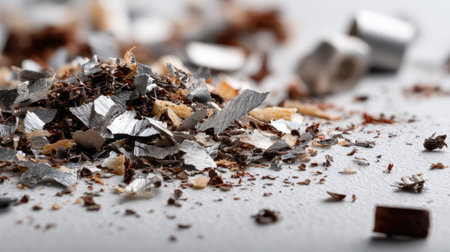 A close-up image featuring small metallic shavings and wood dust scattered on a gray surface, capturing intricate textures and details in an industrial environment.