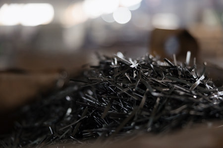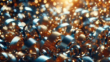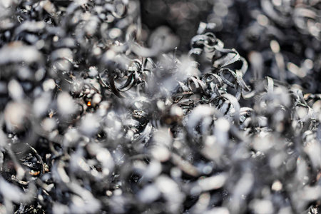 A captivating close-up image of shiny metal shavings scattered on a dark surface, showcasing intricate details of industrial material waste and craftsmanship.