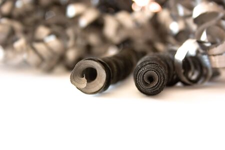 Twisted metal chips (a waste from the metalworking process) lies on a white surface