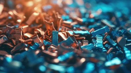 Abstract color background of metal shavings. Processing of ferrous and non-ferrous metals in a factory or plant. Metal background. Colored shavings. Wallpaper or screensaver of colored metallic chips