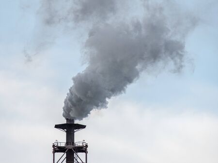 Industrial chimney with thick smoke polluting the air during the day in winter close up. High quality photo