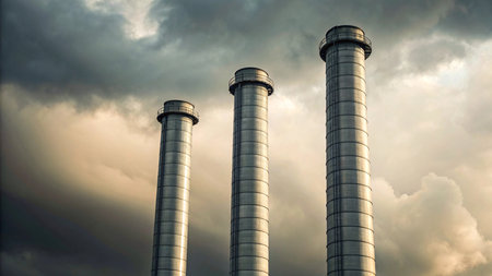 Three industrial metal Industral chimneys.against a blue sky.graphic,room for text.
