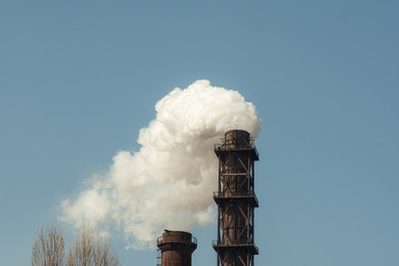 Dense smoke and steam coming out from the industrial chimney. Environmental Pollution concept.