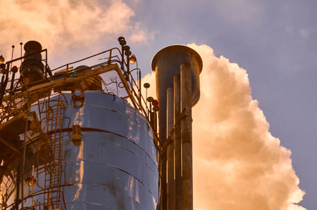 Distillation column at a chemical plant releasing vapor into the sky during sunset, showcasing industrial processes and operations