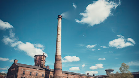 Smokestack in factory with blue sky and clouds