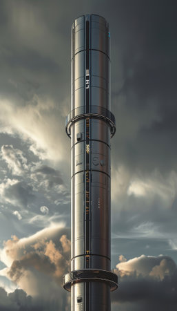 Ladders and walkways encircling an exhaust stack in an industrial complex silhouetted against gray sky, copy space, horizontal aspect