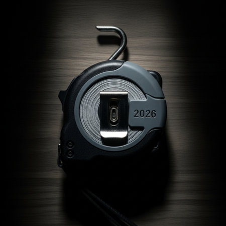 A detailed close-up of a yellow measuring tape resting on a workbench, surrounded by screws and tools, giving a glimpse into a creative workshop environment.