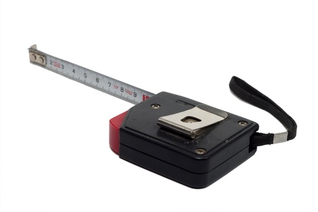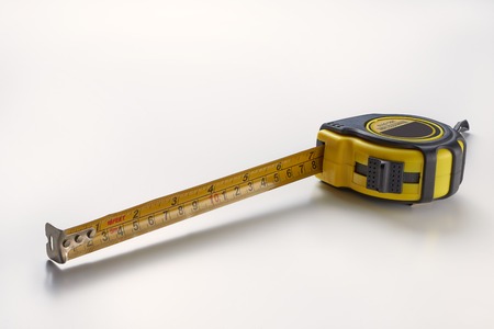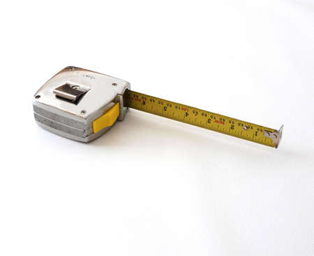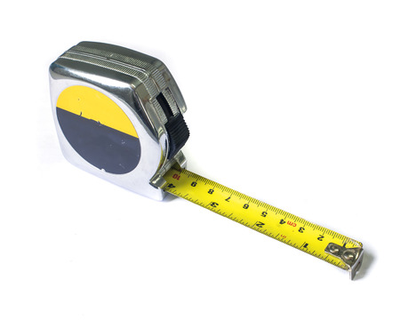 retractable yellow metal measuring tape isolated on a white background. Measurements expressed in centimeters and feet. Construction measuring instrument
