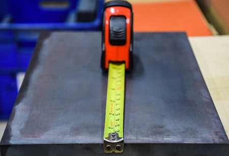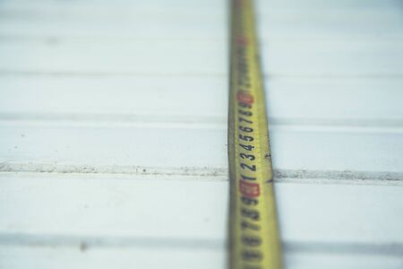Metal ruler and Tape measure centimeters and millimeters on the yellow ruler. Sizes and numbers on the black board