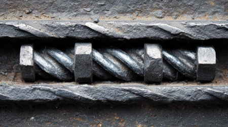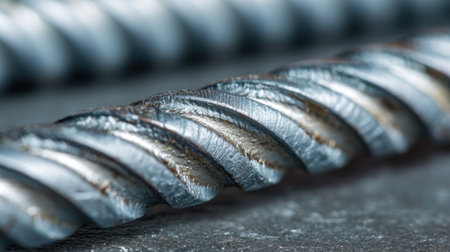 This close-up image showcases metallic rebar featuring a threaded surface, symbolizing strength and durability in construction and engineering projects.