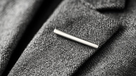 This close-up shot showcases a sophisticated silver tie clip elegantly positioned on a textured gray suit jacket, highlighting men's formal wear.