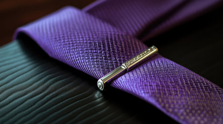 A striking close-up of an elegant purple tie featuring a sleek silver tie clip, resting on a textured black background, perfect for fashion enthusiasts.