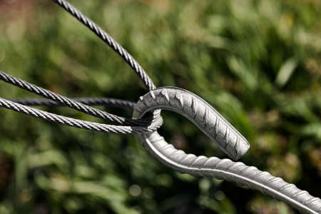 The end knot of steel rope. Stainless steel turnbuckle and sling steel in base. Detail of steel bolt anchor eye in ground