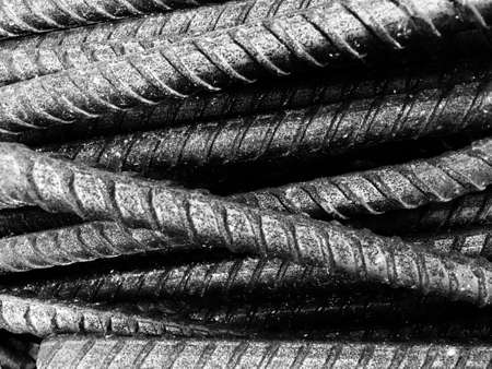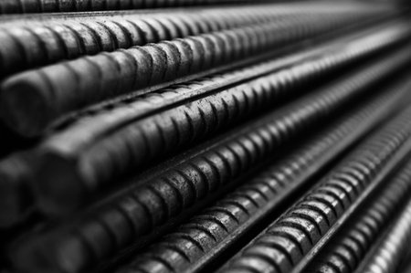 This image showcases several steel rebars, presenting a detailed view of the material. The objects are presented in a grayscale palette with distinct textures and lines. The composition uses shallow depth of field, emphasizing the foreground while the background remains blurred. This image is suited for various commercial applications in construction or engineering.