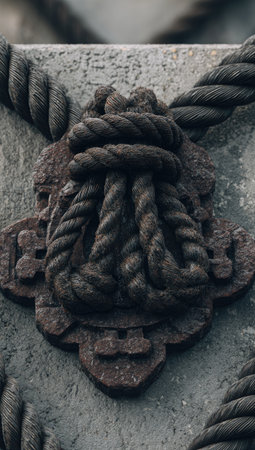 An aged, close-up photograph displays a rope ornament affixed to a stone surface. The composition features a textured, detailed central element against a blurred background. The color palette consists of muted earth tones. Suitable for design, decorative, or historical concepts in commercial and editorial projects.