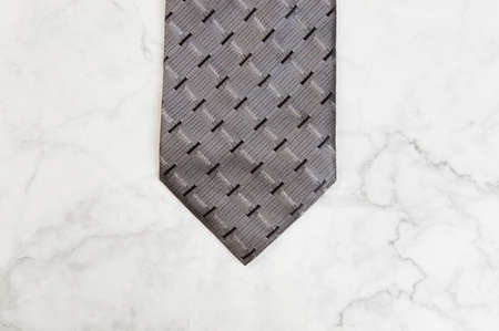 A vertical closeup shot of an elegant formal suit with a white shirt, gray tie, and patterned blazer