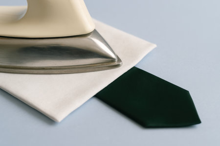 Iron pressing formal white shirt with dark green necktie on clean surface for professional wrinkle free business attire.