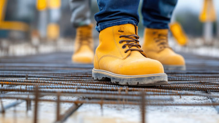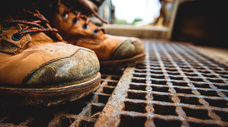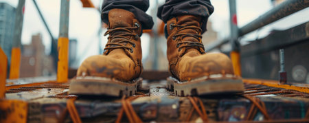 Sturdy work boots rest on textured metal grating, highlighting industrial setting filled with the energy of construction activity.