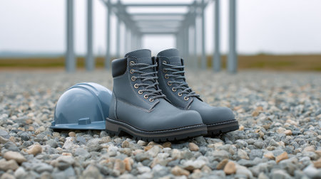 Pair of gray safety boots positioned next to a hard hat on a gravel surface, ideal for depicting themes of construction, safety, and professional diligence in outdoor environments.