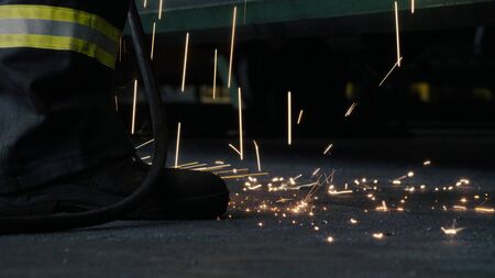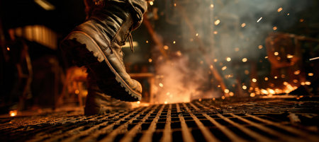 A worker in rugged boots steps over metal grates in a dimly lit workshop. Sparks fly in the background, creating dynamic action lighting in this documentary-style photograph.
