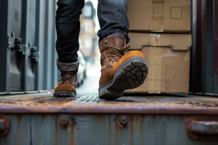 A close-up shot of a mover boots, stepping down from the container truck with a box in hand.