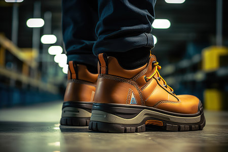 Close-up safety working shoe on a worker feet is standing at the factory, ready for working in danger workplace concept. Industrial working scene and safety equipment